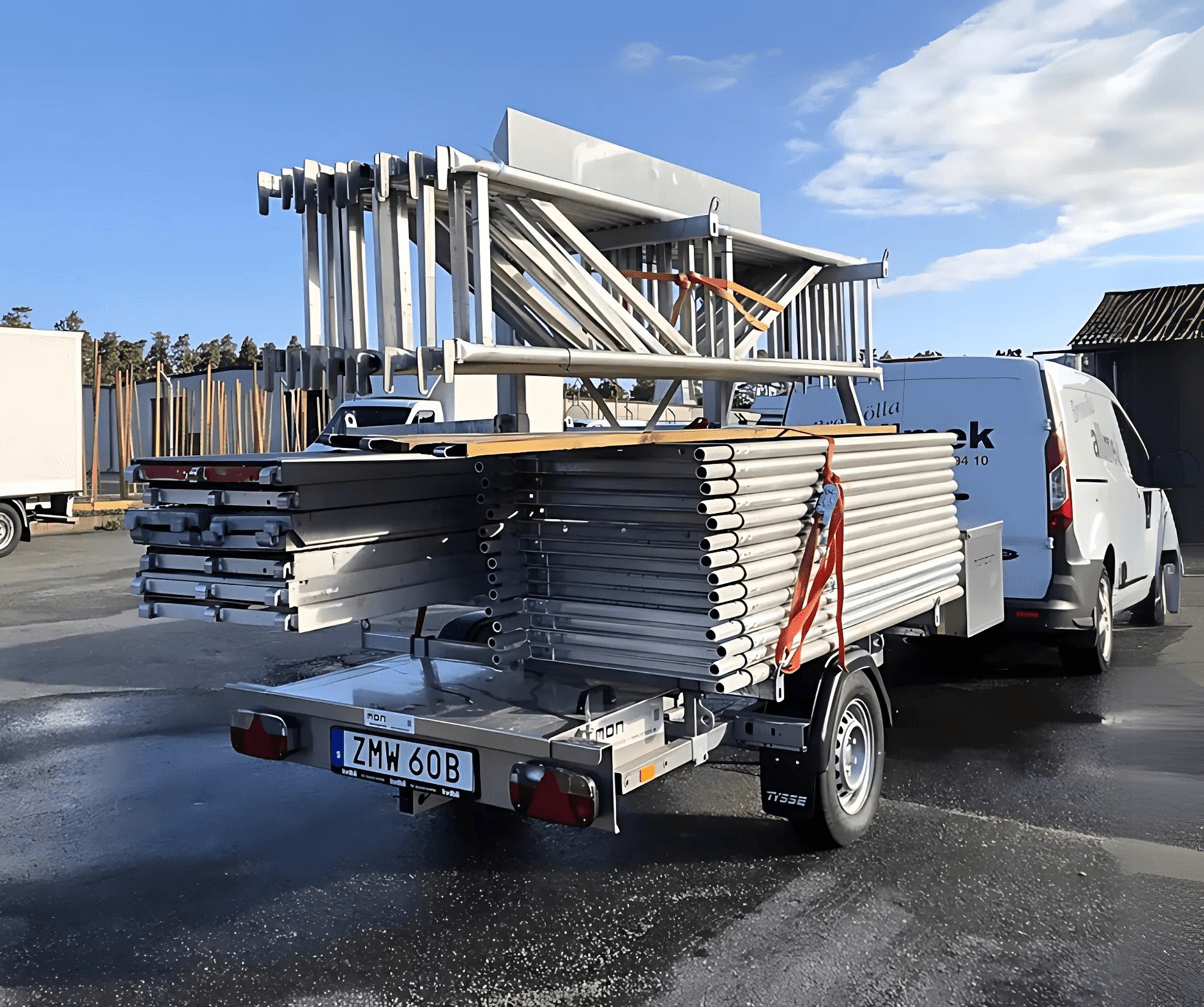 Hyr en komplett och smidig ställningstrailer – perfekt för dig som privatperson eller hantverkare. Vi har två trailers tillgängliga, båda lastade med SpeedyScaf ramställning för 110 m² arbetsyta, inklusive sparklister, förankringsdetaljer och tre steguppgångar – allt du behöver för att montera en säker byggställning själv, till en gavel och en långsida på en villa. Enkel att hantera, godkänd enligt Arbetsmiljöverkets krav och körbar med B-körkort.